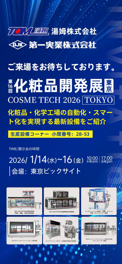 上海一实贸易有限公司日本总部—第一实业株式会社与江苏汤姆智能装备有限公司(TOM)将共同参展2026年1月14日-1月16日参展COSME TECH 2026 TOKYO (第16 回化粧品開発展 東京)。