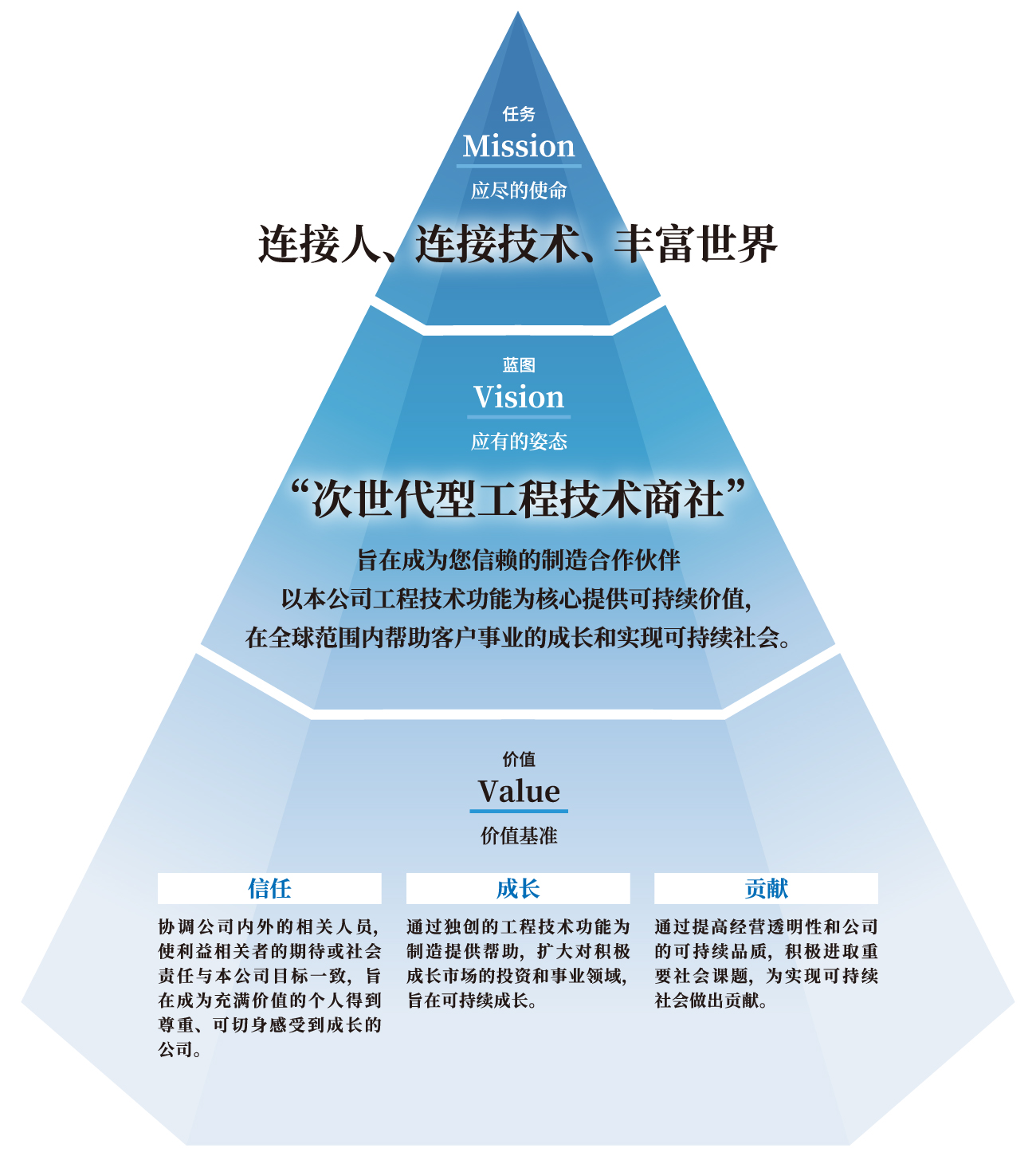 旨在成为您信赖的制造合作伙伴,以本公司工程技术功能为核心提供可持续价值,在全球范围内帮助客户事业的成长和实现可持续社会。