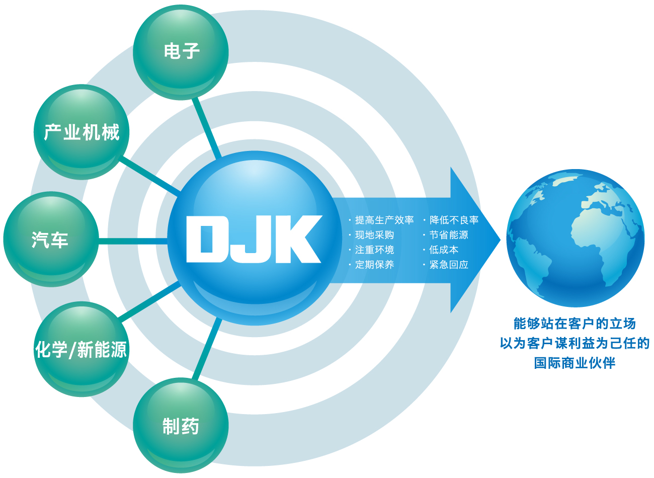 DJK集团在美洲,欧洲,东亚,南亚4个主要地区的主要国家和城市都设有办事处,并以此为支点建立了全球多个销售网络,为客户的业务拓展提供支持。