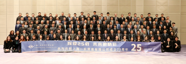 1997-2022年,上海一实在二十五年的历程中,见证了春秋更替,更经历了跌宕起伏,为成就今天的业绩,上海一实全体员工付出了不懈努力。作为一个商贸公司,我们一直以担负经济社会的商品流通为己任,为社会的经济繁荣持续贡献力量。通过团结一致、积极行动以及稳健的经营来推动公司的安定成长。2023年2月25日,上海一实各分公司汇聚一堂,共同庆祝这一具有里程碑意义的时刻。